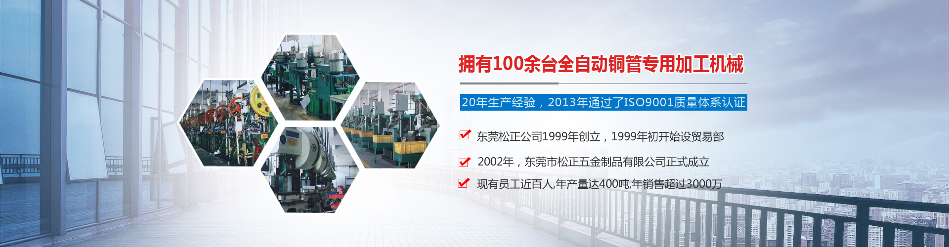 東莞松正公司1999年創立,1999年初開始設貿易部,至2002年,東莞市松正五金制品有限公司正式成立。我公司專業從事銅管/鋁管/ 不銹鋼管、制造、研發,累積了近20年的先進生產經驗,已于2013年6月通過了ISO9001質量體系認證。 公司現共有員工近百人,年產量達到400噸,年銷售超過3000萬.公司共設有7個職能部門,分門別類處理各項日常事務,為方便溝通,還特設有總經理信箱,員工有任何建議和意見均可由此向總經理反應.     在硬件設施方面,公司現擁有全自動銅管專用加工機械近壹百多臺和專業的檢測備,具有較強的生產和檢測能力。舉凡外徑在0.30mm~.....